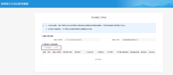 三、點(diǎn)擊“打印申請(qǐng)表”完成后點(diǎn)擊【終止】,協(xié)議狀態(tài)變?yōu)榻K止協(xié)議。