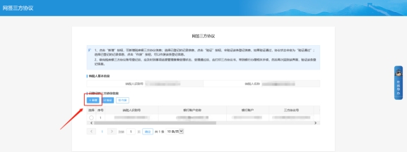四、選擇銀行信息點(diǎn)擊確認(rèn)分別根據(jù)需要選擇或填寫清算行行號(hào)、批扣標(biāo)志、辦理人員身份證件號(hào)碼然后點(diǎn)擊下一步,再返回網(wǎng)簽三方協(xié)議界面。選擇新增的信息點(diǎn)擊驗(yàn)證,協(xié)議狀態(tài)變?yōu)轵?yàn)證通過說明三方協(xié)議簽定成功。