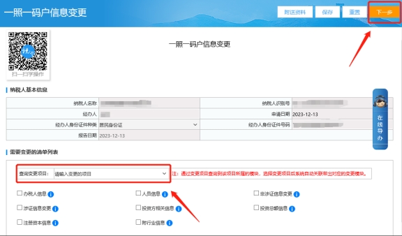 三、一照一碼戶登記信息變更頁面,在查詢變更項(xiàng)目中找相應(yīng)人員的移動電話,填寫變更后內(nèi)容,點(diǎn)擊下一步提交即可。