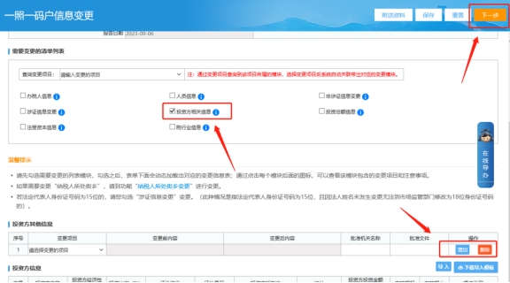 三、一照一碼戶(hù)登記信息變更頁(yè)面,在此界面勾選“投資方相關(guān)信息”系統(tǒng)會(huì)帶出變更項(xiàng)目,請(qǐng)您自行增加或刪除修改,完成后點(diǎn)右上角下一步提交即可。