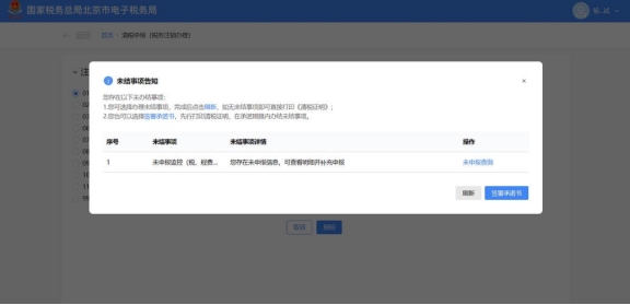 符合即辦注銷資格及條件,但存在未辦結事項,且未辦結事項存在非提示類事項時,系統(tǒng)提示:您存在以下未辦結事項。