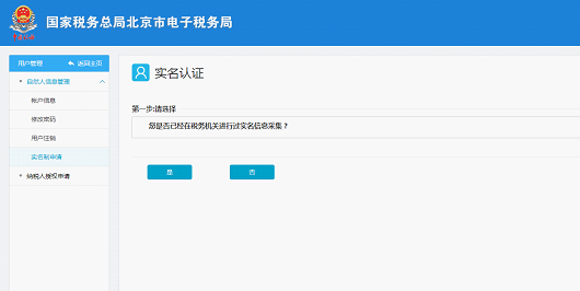 7.? 納稅人點擊“確定”按鈕后,進(jìn)入實名認(rèn)證界面,出現(xiàn)選擇提示“您是否已經(jīng)在稅務(wù)機關(guān)進(jìn)行過實名信息采集”,點擊“是”進(jìn)入關(guān)聯(lián)實名信息界面;點擊“否”進(jìn)入立思辰人臉識別驗證界面;