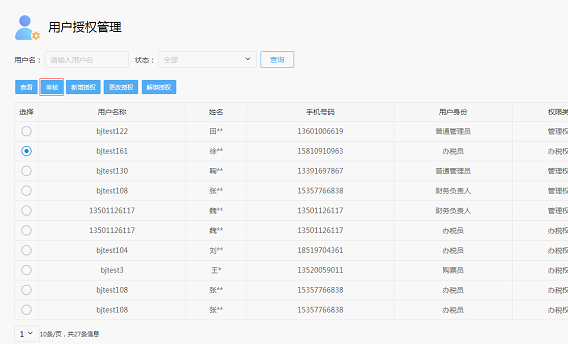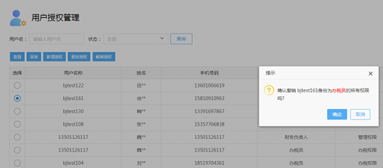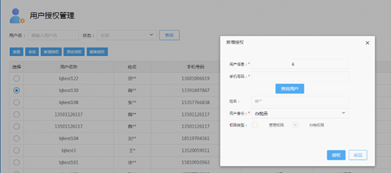 11.????? 企業(yè)授權(quán):納稅人還可進(jìn)行新增授權(quán)操作,輸入用戶信息和手機號碼,查詢出需要授權(quán)的相關(guān)用戶,選擇用戶身份,點擊授權(quán)即可。