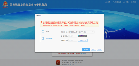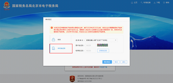 2.? 選擇手機驗證碼登錄,輸入圖片驗證碼,點擊“獲取驗證碼”按鈕,短信平臺會向該人員實名認(rèn)證時登記的手機號發(fā)送驗證碼信息;輸入短信驗證碼,點擊“驗證”按鈕,即可進(jìn)入電子稅務(wù)局首頁界面;