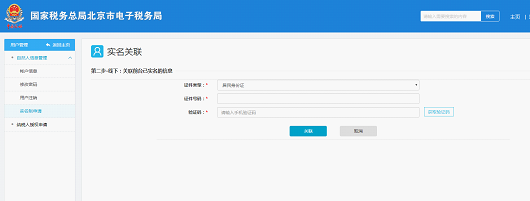 8.? 納稅人點擊“是”,進(jìn)入實名關(guān)聯(lián)信息界面,選擇相關(guān)信息填寫后,進(jìn)行信息驗證后,點擊“關(guān)聯(lián)”按鈕。
