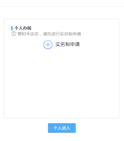 5.? 納稅人進(jìn)入實名申請界面,首先進(jìn)行個人辦稅實名申請,點擊“個人進(jìn)入或?qū)嵜粕暾垺卑粹o。