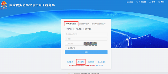 1.? 納稅人進(jìn)入北京市電子稅務(wù)局系統(tǒng),點擊“用戶注冊”按鈕,進(jìn)行用戶注冊;