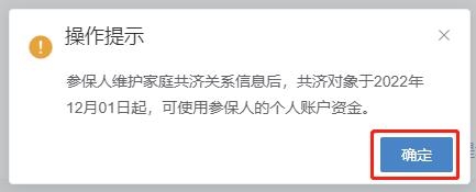 第三步:查看【操作提示】:參保人維護家庭共濟關(guān)系信息后,共濟對象于2022年12月01日起,可使用參保人的個人賬戶資金。點擊【確定】按鈕。