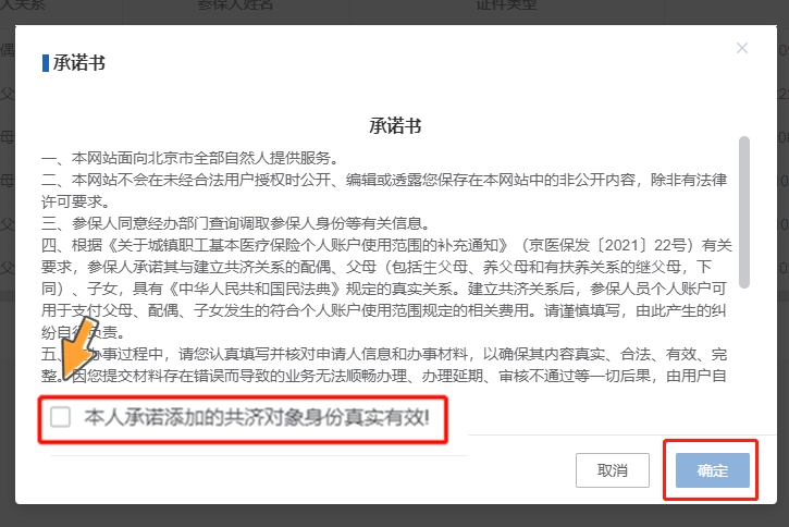 第二步:查看承諾書,勾選【本人承諾添加的共濟對象身份真實有效!】,點擊【確定】按鈕。
