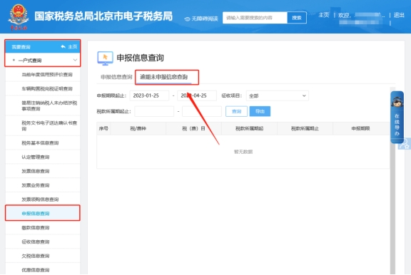 二、我要查詢—一戶式查詢—申報信息查詢—逾期未申報信息查詢,調(diào)整查詢條件查看。