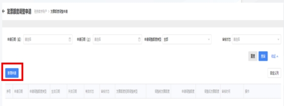 您也可以進入【開票業(yè)務】--【藍字發(fā)票開具】界面,點擊“去調整”,系統(tǒng)將自動跳轉至發(fā)票額度調整申請界面。進入發(fā)票額度調整申請界面后,點擊【新增申請】