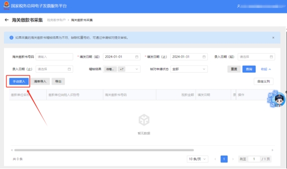 四、點擊【手動錄入】錄入海關繳款書信息,點擊“確定”成功后,稍后可在查詢界面根據(jù)需要輸入或選擇相關查詢條件,然后點擊“查詢”按鈕,在結果展示區(qū)顯示符合查詢條件的海關繳款書。