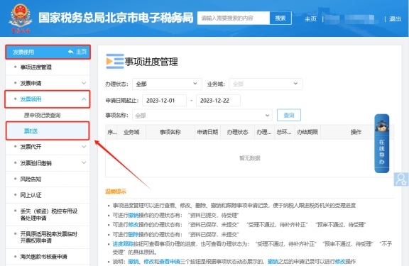 若申領的是紙質發(fā)票,等狀態(tài)變成配送中,右方的操作欄中就會出現“打印發(fā)票收票單”,打印出來蓋章給快遞員即可。