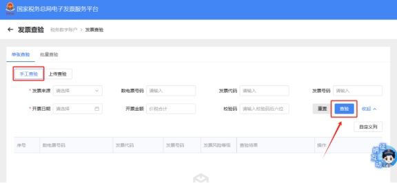 三、發(fā)票查驗(yàn)進(jìn)入查詢界面,選擇“手工查驗(yàn)”并按實(shí)際情況填寫(xiě)相應(yīng)項(xiàng)目,點(diǎn)擊“查驗(yàn)”,系統(tǒng)會(huì)顯示對(duì)應(yīng)發(fā)票查驗(yàn)結(jié)果。