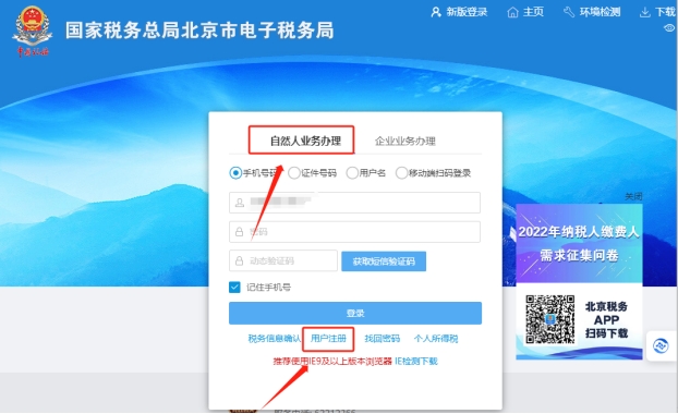 一、點擊北京市電子稅務局自然人業(yè)務辦理——點擊用戶注冊,完成個人賬戶注冊,注冊成功后登錄自然人業(yè)務辦理進入后按照提示做實名認證。