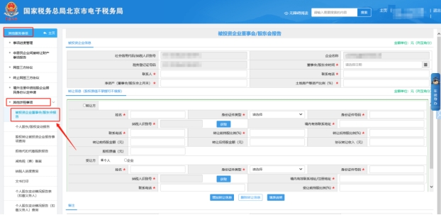 首先被投資企業(yè)登錄北京市電子稅務局備案(填寫兩張表)路徑:請您點擊【我要辦稅】—【其他服務事項】—【其他涉稅事項】—【被投資企業(yè)董事會/股東會報告和個人股東/股權變動報告】;