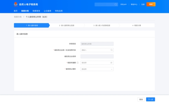 申報界面分為四個步驟,首先是錄入基本信息,在系統(tǒng)中錄入被投資企業(yè)統(tǒng)一社會信用代碼,選擇稅款所屬期、股權轉讓情形等。其次是錄入股權轉讓信息,該部分由“被投資企業(yè)信息”“股權轉讓方信息”“股權受讓方信息”及“附報資料”四部分組成,點擊“被投資企業(yè)信息”右側的“填寫”,進入填寫頁面。