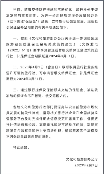 北京市文化和旅游局發(fā)布關(guān)于延長旅游服務(wù)質(zhì)量保證金補足期限的通知,北京市已享受暫退或暫緩交納保證金政策的旅行社,補足保證金期限延至2024年3月31日。