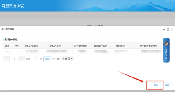 四、在彈出的網(wǎng)頁中選擇銀行賬戶信息點擊確認(rèn),進(jìn)入填表頁面,選擇對應(yīng)的清算銀行號,會自動帶出開戶銀行行號,確認(rèn)信息無誤后可以點擊保存填表信息;點擊下一步提交表單,受理完成后可以在事項進(jìn)度管理查看受理系統(tǒng)回執(zhí)單。納稅人辦理完成之后,若所選銀行為直簽銀行,可以在網(wǎng)簽三方協(xié)議頁面,選擇對應(yīng)的信息,直接點擊驗證。