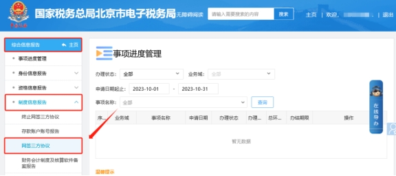 二、綜合信息報告—制度信息報告—網(wǎng)簽三方協(xié)議。