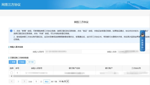 答:您好,可通過電子稅務(wù)局首頁【我要辦稅】—【綜合信息報告】—【制度信息報告】—【網(wǎng)簽三方協(xié)議】點擊新增按鈕,在彈出的網(wǎng)頁中選擇銀行賬戶信息點擊確認(rèn),進(jìn)入填表頁面,選擇對應(yīng)的清算銀行號,會自動帶出開戶銀行行號,確認(rèn)信息無誤后可以點擊保存填表信息;點擊下一步提交表單,受理完成后可以在事項進(jìn)度管理查看受理系統(tǒng)回執(zhí)單。納稅人辦理完成之后,若所選銀行為直簽銀行,可以在網(wǎng)簽三方協(xié)議頁面,選擇對應(yīng)的信息,直接點擊驗證;若納稅人所選銀行不是直簽銀行,納稅人需要在【我要查詢】—【辦稅進(jìn)度及結(jié)果信息查詢】—【涉稅文書查簽】選擇對應(yīng)的事項名稱,下載打印之后去所選銀行辦理簽約業(yè)務(wù),辦理完成之后,再登錄電子稅務(wù)局【我要辦稅】—【綜合信息報告】—【制度信息報告】—【網(wǎng)簽三方協(xié)議】選擇要驗證的信息點擊驗證,顯示驗證通過即可。
