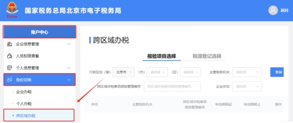 二、賬戶中心—身份切換—跨區(qū)域辦稅。