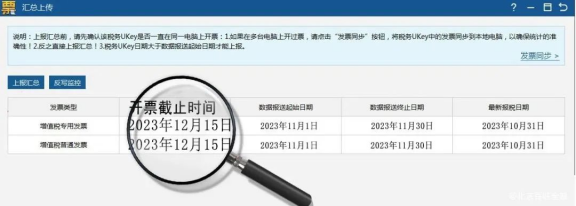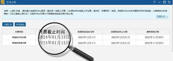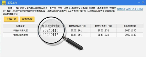 ●反寫監(jiān)控:申報成功后,點(diǎn)擊【數(shù)據(jù)管理】-【匯總上傳】-【反寫監(jiān)控】,開票截止時間更新到2024年1月15日表示成功。