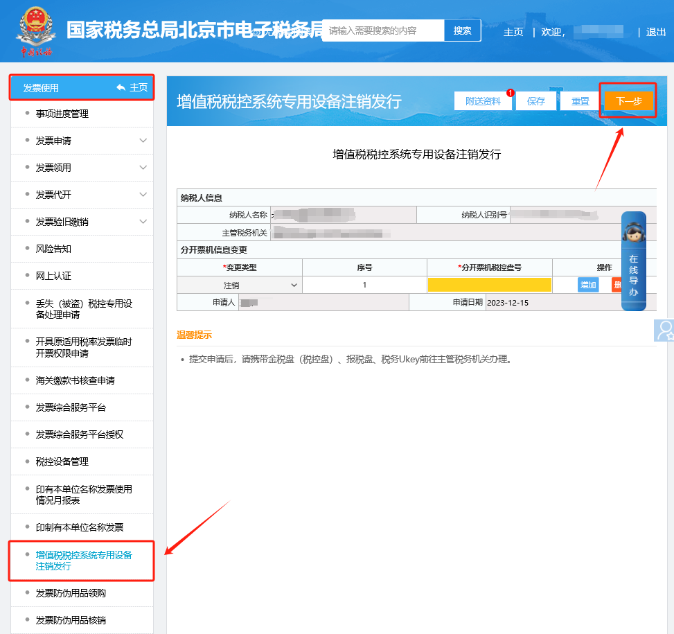 二、發(fā)票使用—增值稅稅控系統(tǒng)專用設(shè)備注銷發(fā)行,進(jìn)入即可展現(xiàn)填寫界面,請根據(jù)頁面信息填寫完畢并上傳附送資料信息,點(diǎn)擊下一步提交。