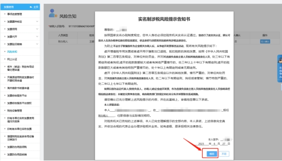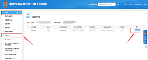 二、發(fā)票使用—風(fēng)險告知,進入雙向?qū)嵜J(rèn)證模塊(此處只顯示當(dāng)前登錄人員的信息,所以需要給誰做雙向?qū)嵜J(rèn)證,則需要使用該人員的信息驗證登錄),點擊【本人確認(rèn)】。
