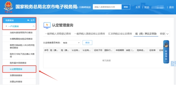 (2)請您點擊【我要查詢】—【一戶式查詢】—【認(rèn)定管理查詢】—【稅(費)種認(rèn)定查詢】,查詢條件選成全部查詢。