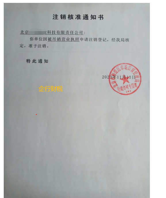注銷核準(zhǔn)通知書  北京XXXX科技有限責(zé)任公司:  你單位因被吊銷營(yíng)業(yè)執(zhí)照申請(qǐng)注銷登記,經(jīng)我局核定,準(zhǔn)予注銷?! √卮送ㄖ ?023年11月13日..
