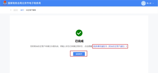 納稅人不存在未辦結(jié)事項(xiàng)。系統(tǒng)直接跳轉(zhuǎn)至取消非正常戶(hù)認(rèn)定辦理成功界面,點(diǎn)擊【《稅務(wù)事項(xiàng)通知書(shū)(取消非正常戶(hù)通知)》】可下載對(duì)應(yīng)文書(shū)。點(diǎn)擊【返回首頁(yè)】可返回系統(tǒng)首頁(yè)。